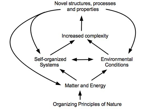 Tracing through the diagram above: Everything is based on the organizing principles of nature. They organize matter and energy from which self-organized systems and environmental conditions arise. Those products tend to produce increased complexity and out of that increased complexity novel structures, processes and properties emerge.